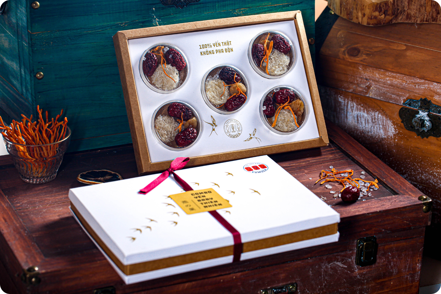 Chiếc hộp khiến ai nhìn cũng phải “Ồ!” vì thiết kế như một chiếc rương kho báu: màu đỏ sang trọng, viền xanh vân sóng, nắp mở kiểu Nhật truyền thống. Bên trong là tổ yến nguyên chất thượng hạng to, trắng, đều sợi. Tặng combo này là kiểu quà “gây choáng ngợp”: dành cho sếp, khách VIP, đối tác lâu năm, bố mẹ dịp Tết.
