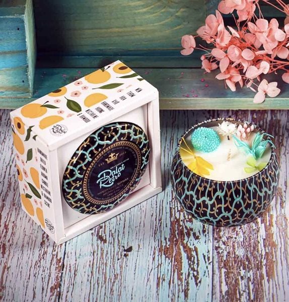 Nến thơm, 120g, hộp, mẫu hộp thiếc hoa văn, hương peach, Dalat Retro