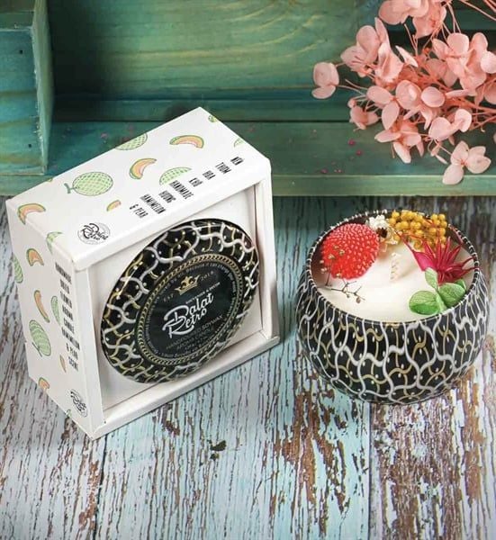 Nến thơm, 120g, hộp, mẫu hộp thiếc hoa văn, hương hamimelon and pear, Dalat Retro