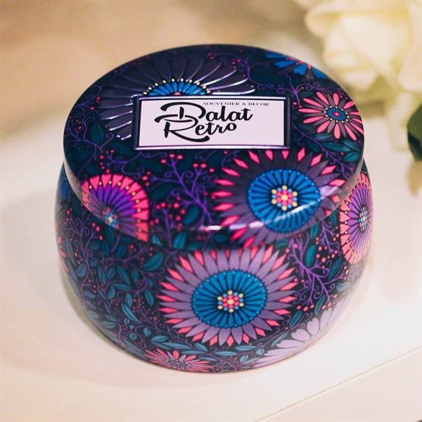 Nến thơm, 120g, hộp, mẫu hộp thiếc hoa văn, hương blanc velvet, Dalat Retro